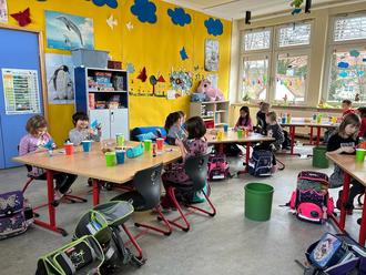 Bei kleinen Naschereien und Apfelschorle bastelten die Kinder eifrig für alle Schülerinnen und Schüler der Grundschule Mitteleschenbach Osternester aus bunten Pappbechern.