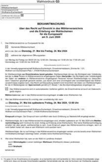 über das Recht auf Einsicht in das Wählerverzeichnis und die Erteilung von Wahlscheinen für die Europawahl am 9. Juni 2024
