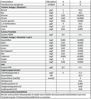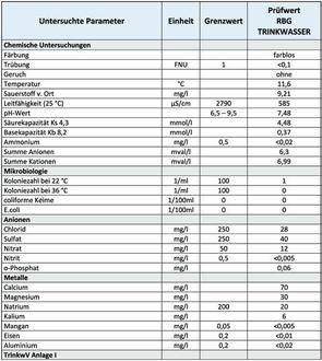 Analysewerte zum abgegebenen TRINKWASSER: