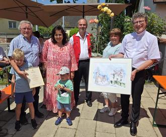 Das diesjährige Pfarrfest war der passende Rahmen um den langjährigen Leiter des Pfarrgemeinderates und Mitglied der Kirchenverwaltung, Josef Kopp gebührend zu verabschieden. Der Kopp Joe, wie ihn die Mitteleschenbacher nennen, wurde 1999 in den Pfarrgemeinderat gewählt und übernahm dort auch gleich den Vorsitz. Als 13 Jahre später die Kirchenverwaltung ein neues Mitglied brauchte, war es naheliegend, dass er als „Banker“ in dieses Gremium wechselt und dort mit Verantwortung übernimmt. Bis 2024 ging Joe stets mit gutem Beispiel voran, war sich für keine Arbeit zu schade und fand auch immer wieder tatkräftige Helfer, die ihn bei vielen Arbeiten unterstützten. In all den Jahren war er stets ein humorvoller, meist ruhiger Macher, weswegen er sicher fehlen wird. Aber nach insgesamt 25 Jahren in denen er immer gerne den Dienst für „seine“ Pfarrei verrichtete und mit zunehmendem Alter war es auch verständlich, als er bei den letzten Wahlen 2024 das Amt ablegte. Für diese lange Zeit im Ehrenamt bedankte sich nun die Pfarrgemeinderatsvorsitzende Kerstin Seitz-Knechtlein, zusammen mit Pfarrer Thomas Swat bei Josef Kopp und überreichte ein eigens für ihn gemaltes Aquarell, welches die beiden Kirchen St. Nikolaus und St. Walburg zeigt. Auch seine Frau Marianne bekam ein Dankeschön, denn sie musste doch oft auf ihn verzichten, wenn er wieder mal wegen einer der beiden Gremien und Kirchen „außerhaus“ zu tun hatte. Sie bekam einen Rosenstock vom neuen Kirchenpfleger Josef Schlund überreicht und war sichtlich erfreut über diese schöne Geste. Joe bedankte sich abschließend noch von seiner Seite bei allen, die ihm während dieses Viertel Jahrhunderts stets unterstützt haben und ist sich sicher, dass es auch weiterhin gut laufen wird in der Pfarrei.