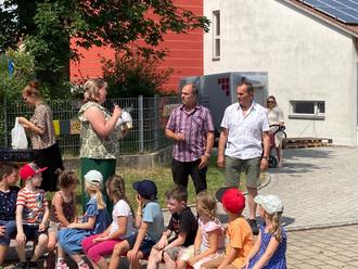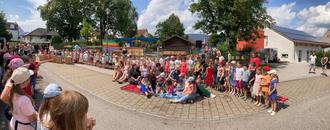Die Kinder haben sich die Wochen vorher schon auf ihren großen Auftritt vorbereitet. Auch ein kurzer Schauer konnte uns nicht stören und die Kinder konnten ihre gelernten Lieder und Gedichte vortragen.