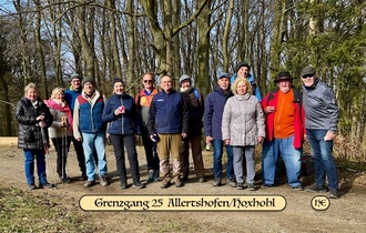Am vergangenen Samstag fand der diesjährige Grenzgang der Ortsteile Allertshofen/Hoxhohl statt. Um 13:00 Uhr versammelten sich elf wanderbegeisterte Teilnehmer am Hoxhöhler Bolzplatz, um gemeinsam auf Wanderung entlang der Gemarkungsgrenzen zu gehen. Das Wetter zeigte sich frühlingshaft, wenn auch noch recht kühl, was die Wanderung jedoch umso angenehmer machte. Die Route führte die Gruppe zunächst oberhalb des Eichköpfelwegs über den Weg "Im Gänsfitsch" und weiter über die Steinkaut zunächst ein Stück in Richtung Hauptstraße. Von dort aus wanderten die Teilnehmer nach Norden bis zum Sieben-Türme-Blick, passierten den Seegerhof und erreichten schließlich über die Hutzelstraße die Neutscher Höhe. Oben angekommen, genossen die Wanderer eine wohlverdiente Rast bei etwas Sonnenschein, die von Thilo Gehrisch und Walter Müller (V.V.) vorbereitet worden war.