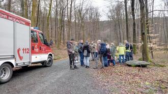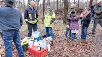 Auch am Radarturm gab es ein kurzes Sammeln der Gruppe, bevor die meisten quer-waldein auf der Grenze liefen. Der Regen hatte tatsächlich wie vorhergesagt aufgehört und am Panoramaweg fand die Gruppe wieder zusammen. An einer Wegekreuzung Richtung Brandau erwartete uns bereits die Freiwillige Feuerwehr Neunkirchen. Die gemeinsame Rast bei Kaffee, Kuchen und anderen Stärkungen war allen sehr willkommen.
