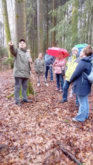 Trotz teilweise kräftigen Schauern fanden sich 20 Teilnehmer*innen auf dem Dorfplatz ein und waren gut ausgerüstet, um sich vom Regen nicht beeindrucken zu lassen. Diverse Wetter-Apps hatten auch ein nahes Regen-Ende angekündigt. Hans-Jürgen Ehrhardt führte die Gruppe zielsicher auf den Wegen und auch abseits davon zu den Grenzsteinen. Unterwegs gab es Interessantes zu erfahren. Bürgermeister Jörg Lautenschläger informierte zum Beispiel über die Lage und Schüttung der Quellen oberhalb von Neunkirchen oder über das Leitungsnetz und die derzeitige Wasser-Versorgung des Ortsteils Lützelbach.
