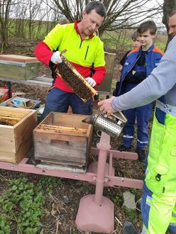 Nun gingen wir Anfang April den nächsten Schritt an. Die Bienen wurden von ihrer alten Beute in die von uns gebaute umgesetzt. Dabei erklärten Christian Bohn und sein Kollege Michael Langer uns alle Schritte des Umsetzens sowie die Arbeit der Bienen detailreich und leicht verständlich. Darüber hinaus haben sie uns interaktiv in die Arbeit eingebunden und uns selbst die Rähmchen umsetzen lassen. Für diese wunderbare Möglichkeit, die Arbeit eines Imkers kennenzulernen und den Prozess unserer Bienen weiter zu beobachten, wollen wir uns bei Christian Bohn und Michael Langer herzlich bedanken.