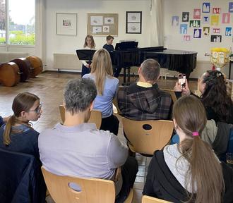 Gemeinsam begrüßten der Fachbereich Musik (Katrin Villemos) und der Fachbereich Kunst (Athanasia Papadopoulou-Poth) die Gäste und stellten kurz die Idee der Veranstaltung vor.