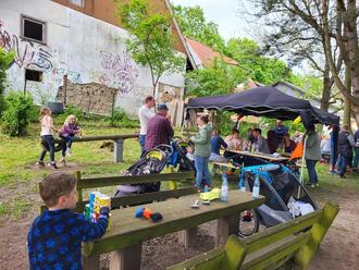 Am Samstag, den 13. Mai, fand ab 15 Uhr unser diesjähriges Spielplatzfest statt – nachdem es eine halbe Stunde vorher so aussah, als müsste wetterbedingt kurzfristig alles abgesagt oder die Badekleidung herausgesucht werden. Doch das Wetter beruhigt sich und wir sorgten mit schnell aufgestellten Pavillons dafür, dass nichts mehr schief gehen konnte. So tummelten sich bereits um kurz nach 15 Uhr viele Kinder, Eltern, Großeltern und Interessierte rund um Sandkasten, Klettergerüst und Schaukel oder machten es sich auf den aufgestellten Sitzmöglichkeiten gemütlich. Die Station mit den Glitzer-Tattoos war von Anfang an ein beliebter Anziehungspunkt nicht nur für die Kinder und so wurde den ganzen Nachmittag/Abend fleißig „tätowiert“.