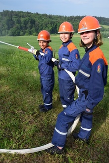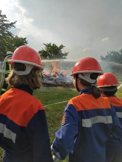 Die Jugendlichen stellten die Löschwasserversorgung über einen Unterflurhydrant her und bauten einen Löschangriff mit 6 C-Rohren auf. So hieß es bereits wenige Augenblicke nach der Ankunft am Brandort „Wasser Marsch“. Die Mädchen und Jungen durften abwechselnd die Brandbekämpfung an vorderster Front organisieren, indem sie ihr jeweiliges Strahlrohr kontrollierten. „Die Arbeit in der Gruppe, das Einstudieren der Abläufe, die Disziplin und Aufmerksamkeit, all das sind auch für Jugendlichen ganz zentrale Lerninhalte“, fasst es einer der Betreuer der Jugendfeuerwehr, Lukas Kraft, zusammen.