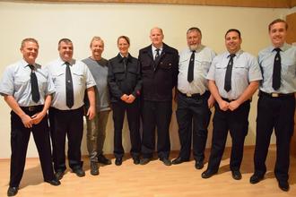 Führung im Förderverein: Der Förderverein der Freiwilligen Feuerwehr Modautal Nord besteht aus dem ersten Vorsitzenden Klaus-Peter Schlatter (Vierter von rechts), seinem Stellvertreter Jürgen Heyd (Dritter von links), dem Schriftführer Gerd Quenzer (Dritter von rechts) und der Rechnerin Claudia Schwentke (Vierte von links). Vervollständigt wird der neue Vorstand von den Beisitzern. Bilder: Feuerwehr