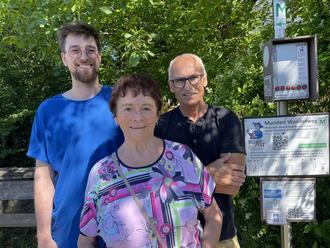 Die Vorstellung der Kirche Neunkirchen an der Babbelbox am Standort vor der Kirche, dem Startpunkt des Modautaler-Mundart-Wanderweges wurde jetzt aktualisiert, denn Ottmar Arnd hatte bisher seine Kirche im heimischem Dialekt vorgestellt. Er ist jetzt drei Jahre im Ruhestand und sein Nachfolger Yannik Schnitzspahn lernt aktuell noch den Odenwälder Zungenschlag. Deshalb hatte Fritz Ehmke die Idee, dass Ottmar Arnd weiterhin die Vorstellung der Kirche in Mundart babbelt und Yannik Schnitzspahn die Simultan-Übersetzung in‘s Hochdeutsche übernimmt. Den letzten Satz hat Yannik Schnitzspahn als Zeichen seines Dialekt- Sprachlichen Fortschrittes dabei sogar schon in Mundart gebabbelt. Gertrud Reining musste bei der Tonaufnahme allerdings bei dem Brenner „Ou und wou“ Unterstützung, auch noch bei Ottmar Arnd geben. Pfarrer Yannik Schnitzspahn berichte dass die Babbelbox insbesondere am Wochenende im Dauerbetrieb zu hören ist, und er freut sich, dass er jetzt selbst seine schönste Kirche im Umkreis an der Babbelbox vorstellen kann.