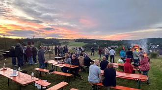 Die Vorzeichen standen zunächst nicht gut für die Asbacher Sonnwendfeier am Freitagabend, dem 21. Juni, als sich kurz vor Beginn der Feier der Himmel über Asbach öffnete und uns einen kurzen, aber heftigen Regenschauer bescherte. Umso erfreulicher war es, dass das Wetter pünktlich zu Beginn um 19 Uhr hervorragend war und viele Besucher sich nicht davon abhalten ließen, auf den „Hohberg“ zur Sonnwendfeier zu kommen.