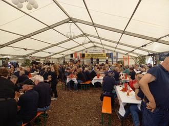 Die weitere Moderation durch den Abend übernahm der stellvertretende Wehrführer Kevin Klemm. Aufgelockert wurde das Programm durch Tanzeinlagen der Turbobienen-Kindergruppe und der DATZ Jugendgruppe des Landfrauenvereins Gadernheim. Der anschließende Festbieranstich leitete den gemütlichen Teil des Abends ein, der auch vom Fußball-EM-Spiel der deutschen Nationalmannschaft gegen Schottland geprägt war, das sich die Gäste gemeinsam auf der Leinwand anschauten. Für das leibliche Wohl sorgte das Team von Wiesengrabe. Die im Vorfeld eigens gebaute Bar wurde rege und lange genutzt Am nächsten Tag ging es weiter mit einem Auftritt der Band Daily Friday, die ihre Wurzeln in Lützelbach hat. Doch bevor es soweit war musste der durch die nächtlichen Regenfälle völlig aufgeweichte Boden noch präpariert werden, was liegt da näher als Hackschnitzel, die kurzerhand besorgt wurden und von den vielen Helfern im Zelt verteilt wurde. Auch dank dieser Vorarbeit konnte Daily Friday vor einem mit knapp 500 Besuchern belegten Zelt ihr Repertoire zum Besten geben. Dabei hatte auch Dennis Roßmann mal wieder einen Gastauftritt an „seinem“ Schlagzeug. Der „harte Kern“ hat erwartungsgemäß bis in die frühen Morgenstunden ausgehalten. Am frühen Sonntagmorgen wurde das Zelt wieder bestuhlt um den Festsonntag gebührend feiern zu können. Um 10 Uhr durfte Pfarrer Yannick Schnitzspahn zum Festgottesdienst im Zelt begrüßen. Musikalisch wurde er von einem E-Klavier sowie der Stimme und Gitarre seiner Schwester begleitet. Im Anschluss an den Gottesdienst betraten die Kleestädter Feuerwehrmusikanten die Bühne, die dankenswerterweise kurzfristig eingesprungen sind aber alles andere als Ersatz waren sondern das Publikum im erneut voll besetzten Zelt mit ihrem Programm begeisterten. Für das leibliche Wohl war mit Schnitzel und Braten sowie frisch gezapftem Bier und ofenfrischen Brezeln selbstverständlich bestens gesorgt. Dazu gab es noch ein reichhaltiges Kuchenbuffett und eine Eis-Auswahl. Auf dem Festplatz vorm Zelt war eine kleine Fahrzeugschau aufgebaut mitsamt der Drehleiter aus Ober-Ramstadt, mit der Schwindelfreie auch in die Höhe fahren durften. Die Kinder konnten sich schminken oder „tätowieren“ lassen und auf dem Karussell einige Runden drehen. Am Nachmittag sorgte der singende Landwirt noch einmal für Stimmung im Zelt, es wurde bis abends spät gefeiert, getrunken und gelacht. Die Feuerwehr Lützelbach durfte anlässlich des Jubiläums in diesem Jahr den traditionellen Kreisfrühschoppen der Ehren- und Altersabteilung ausrichten, was dem Vorstand ein besonderes Anliegen und eine große Ehre war. So konnten sich montags fast 400 angemeldete Gäste die warmen Speisen und kühlen Getränke gut schmecken lassen, die das Küchenteam zubereitete und von den Kellnern an den Tisch gebracht wurden. Selbstverständlich wurde auch hier die Eine oder Andere Ansprache gehalten, jeweils begleitet von der Zusage von einem Fass Freibier. Zu den Rednern und Spendern gehörten Schirmherr Bürgermeister Jörg Lautenschläger, Bundestagsabgeordnete Astrid Mannes, Landtagsabgeordneter Peter Franz, Landrat Klaus Peter Schellhaas und Erster Kreisbeigeordneter Lutz Köhler sowie Klaus Pipping für den Vorstand des Feuerwehrvereins. Dazu sorgte Peter Fischer mit live-Musik für beste Stimmung. 4 Tage Fest feiern geht natürlich nur mit entsprechenden Gästen, wir bedanken uns bei den zahlreichen Besuchern, die wir begrüßen durften. An dieser Stelle ein herzliches Dankeschön an die Sponsoren der Bannerwerbung, an alle Helfer, die durch ihre Mitarbeit zum Gelingen dieses Festes beigetragen haben. Auch die wochenlange Vorarbeit von Vorstand, Einsatzabteilung und Jugendfeuerwehr hat sich gelohnt, es war ein tolles Jubiläum und motiviert für die Planung von weiteren Veranstaltungen.