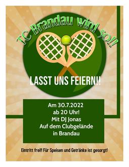 Der TC Brandau lädt zur Jubiläumsfeier am 30.07.2022 ab 19 Uhr auf dem Vereinsgelände recht herzlich ein.