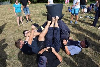 Beim „Socken ausziehen“ ging es um eine gefüllte Wasserbütt die auf acht bis zehn Füßen ruht und wer es dennoch schafft, sich seiner Socken zu entledigen, ohne das der Pott herunterfällt, hat gewonnen. Es war ein spannendes Kopf-an-Kopf-Rennen, die Socken flogen über den Sportplatz und am Ende haarscharf – holte sich die Einsatzabteilung ihren ersten Punkt und es stand 1:1.