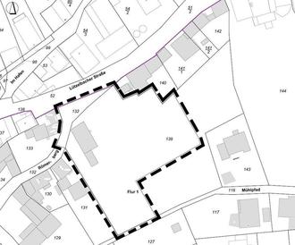 Auszug aus dem amtlichen Liegenschaftskataster mit Eintragung der Grenze des räumlichen Geltungsbereichs für den Bebauungsplan „Zwischen Römerberg und Mühlpfad“ (strichlierte Umgrenzungslinie), Darstellung ohne Maßstab