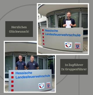 Diese engagierten Kameraden haben sich jeweils zwei Wochen erfolgreich an der hessischen Landesfeuerwehrschule weitergebildet und Ihr Wissen, sowie Ihre Fähigkeiten erweitert. Erfolgreich wurde einmal der "Zugführer-Lehrgang" und einmal der "Gruppenführer-Lehrgang" absolviert.
