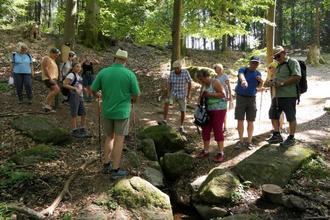 19 Wanderer trafen sich auf dem Parkplatz in Lützelbach um die 4 Quellen um Neunkirchen zu finden. Stetig leicht bergauf ging es zur Modauquelle und weiter zum höchsten Apfelbaum, wo man sich mit entsprechendem Getränk stärkte. Nun ging es zur Lauterquelle, deren Wasser, wie die Modau, in den Rhein mündet. Weiter ging der Weg vorbei am Hexenstein hinauf zum Kaiserturm. Dort gab es eine kurze Pause zum Stärken. Von nun an ging es bergab. Auf dem Weg nach Neunkirchen kam man an der Gersprenzquelle vorbei. In Neunkirchen konnte man dann die Heilige Quelle bestaunen und sich am kühlen Wasser erfrischen. Abwärts ging der Weg zur Fischbachquelle, die mitten in einer Wiese am grünen Gras, aber keinem Wasser, zu erkennen war. Das gefasste Wasser der Quelle ist dann erst in Lützelbach zu finden. Der Abschluss der 9 km langen Tour war dann im Gasthaus „Spitzewirt“, wo wir uns im Biergarten erholen konnten.
