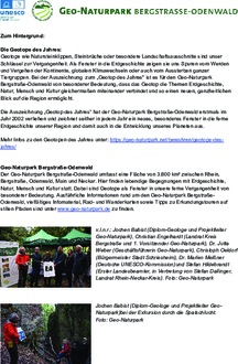 Der Geo-Naturpark Bergstraße-Odenwald umfasst eine Fläche von 3.800 km² zwischen Rhein, Bergstraße, Odenwald, Main und Neckar. Hier finden lebendige Begegnungen mit Erdgeschichte, Natur, Mensch und Kultur statt. Dabei sind Geotope als Fenster in unsere ferne Vergangenheit von besonderer Bedeutung. Ausführliche Informationen rund um den Geo-Naturpark Bergstraße-Odenwald, vielfältiges Infomaterial, Rad- und Wanderkarten sowie Tipps zu Erkundungstouren auf stillen Pfaden sind unter www.geo-naturpark.de zu finden.