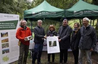 v.l.n.r.: Jochen Babist (Diplom-Geologe und Projektleiter Geo-Naturpark), Christian Engelhardt (Landrat Kreis Bergstraße und 1. Vorsitzender Geo-Naturpark), Dr. Jutta Weber (Geschäftsführerin Geo-Naturpark), Christoph Oeldorf (Bürgermeister Stadt Schriesheim), Dr. Marlen Meißner (Deutsche UNESCO-Kommission)und Stefan Hildebrandt (Erster Landesbeamter, in Vertretung von Stefan Dallinger, Landrat Rhein-Neckar-Kreis).