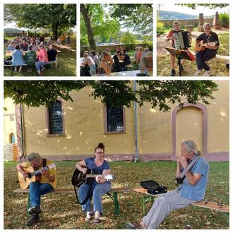 Schließlich traf die Wandergruppe wieder in Neunkirchen ein, wo man sich im herrlichen Kirchgarten niederließ. Dort, im Schatten der alten Bäume, konnte man die Seele baumeln lassen und sich an den musikalischen Darbietungen erfreuen und staunen, welche Talente bei uns beheimatet sind. Es waren dieses Mal Peter Roßmann (Pit) und Karlheinz Hach (Charly) aus Lützelbach sowie Katharina Maul (1. Vorsitzende 11 Orte e.V. und Butze-Chefin) und Gerhard (Gret) Thaler aus Neunkirchen. Selbstverständlich wurden auch von einigen Akteuren Verse aus dem Modautal-Lied, getextet und komponiert, sowie auf der Gitarre begleitet von Michael Partheil, gesungen und der herrliche Tag bei schönstem Wetter in froher Runde ausklingen lassen.
