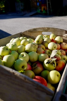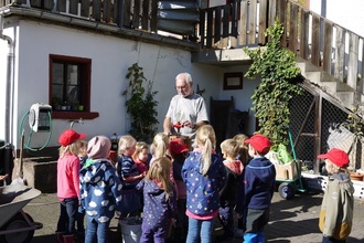 Nach dem Frühstück machten sich die Zwerge und Kobolde am Donnerstagmorgen dem 22.09. auf den Weg zu Familie Lehr. Mit im Gepäck hatten sie einen Bollerwagen voller Äpfel. Diese wurden nur wenige Tage zuvor von dem eigenen Apfelbaum, der vor 25 Jahren mit den damaligen Kindergartenkindern gepflanzt wurde, geerntet. Die Äpfel der Apfelbaumsorte Jakob Fischer, sollten nun verarbeitet werden. Wie schon in den vergangenen Jahren, wurden die Bierbzewerge herzlich von Werner und Brigitte Lehr empfangen.