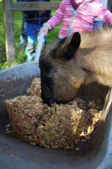 Die kleine Menge Kernobst wurde zuerst im Sandtrog gründlich mit Wasser abgespritzt und gewaschen. Anschließend kamen sie in einen Häcksler und wurden zerkleinert. Die Begeisterung der Kinder über die tanzenden Äpfel im Häcksler, war ihnen ins Gesicht geschrieben. Die hinterbliebene Maische, wurde nachfolgend in die Obstpresse gegeben und schon fing der Saft an zu laufen. Alle durften einen kleinen Schluck probieren…Fazit: „mmmh so lecker!“. Zur Freude aller konnten ganze zwölf Liter in mitgebrachte Kanister und Flaschen abgefüllt werden. Den leckeren, sehr süßen Apfelmost mochten alle Kinder gern. Auch Hofziege Wilma kam nicht zu kurz, sie durfte die Reste der ausgedrückten Äpfel verspeisen.
