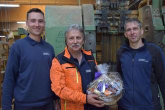 Aus einem wurden 40 Jahre: Der 60jährige Manfred Rettig feiert beim Sägewerk Gehrisch sein Dienstjubiläum. Es gratulieren die beiden Geschäftsführer Philipp Gehrisch (links) und Sascha Marasek. Foto: Sägewerk Gehrisch