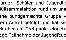 Eine bundgemischte Gruppe von 16 echten „Umwelt-Aktivisten“ ist dem Aufruf gefolgt und hat sich am frühen Samstagmorgen des 21. Oktober am Treffpunkt eingefunden. Besonders gefreut hat mich die rege Teilnahme der Jugendfeuerwehr und der Kinder!