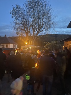 Mit Michael Partheil und seinem Laternenhut vorneweg zogen wir anschließend traditionell durch die Straßen und sangen unsere liebsten Laternenlieder. Abseits der Hauptstraße wurde in der Dunkelheit das Lied "Finster, Finster" angestimmt, was für viele Erwachsene, aber besonders für die Kinder wieder mal ein Highlight der Strecke war.