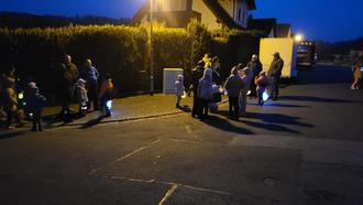 Dank der Absicherung durch die Feuerwehr konnten wir unbeschwert unseren Laternenumzug entlang der Hauptstraße starten. An dieser Stelle noch einmal vielen Dank an die Feuerwehr für ihre Unterstützung! Über die Brückenstraße führte uns der Zug zu LIA, wo wird im Gemeinschaftsraum - durch die bunten Laternen und den stimmungsvollen Gesang - die Augen der Bewohner zum Leuchten bringen konnten. Als Dankeschön erhielten die Kinder eine Süßigkeit und konnten sich so gestärkt auf den Rest des Weges machen. Über Brückenstraße, Höhenstraße und den Weg am Sportplatz trafen wir um 18:30Uhr am Sportheim ein, wo wir unter dem Balkon von fleißigen Helfern mit frisch gebackenen Waffeln, knackigen Würstchen und warmen und kalten Getränken begrüßt wurden. Auch das traditionelle Lagerfeuer war entzündet und wurde zum Aufwärmen genutzt.