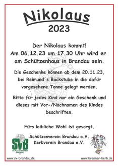 Der Nikolaus kommt nach Brandau! Am 06.12.23 um 17:30 Uhr wird er am Schützenhaus in Brandau sein. Die Geschenke können bei Reimund’s Backstube in die dafür vorgesehene Tonne gelegt werden. Bitte für jedes Kind nur ein Geschenk und dieses mit Vor-/Nachnamen des Kindes beschriften.