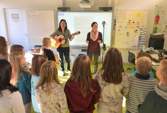 Da waren Christine Hechler, Erzieherin und Sängerin aus Lautertal-Reichenbach und Fritz Ehmke von den Socken, denn bereits bei ihrem zweiten Besuch in der Modautalschule Ernsthofen sangen die Schüler der Klasse 4a das Kaiserturmlied mit sichtlich großer Freude und Begeisterung perfekt für die Tonaufnahme. Tina Friedrich, die Klassenlehrerin hatte vorbereitend mit ihrer Klasse 4a das melodische und beschwingte Lied fleißig eingeübt.