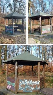 in der Nacht vom 26.11.2025 auf den 27.11.2025 wurde die „Wilhelmshütte“, welche sich auf dem Rundweg am Friedhof in Brandau befindet, mit Farbe besprüht.