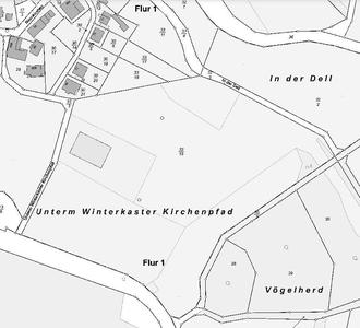 Abbildung: Grenze des räumlichen Geltungsbereichs des Bebauungsplans „Unterm Winterkaster Kirchenpfad“ sowie der teilbereichsbezogenen Änderung des Flächennutzungsplans (schwarz-strichlierte Umgrenzungslinie), unmaßstäbliche Abbildung.