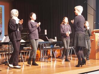 Am Sonntag, den 5.2.2023 fand der diesjährige Neujahrsempfang der Stadt Groß-Bieberau statt. Traditionsgemäß nahmen Ensembles der Albert-Einstein-Schule an der musikalischen Gestaltung der Veranstaltung teil. Die Schülerinnen des Schulchorsunter der Leitung von Alexandra Bauer sangen „Bring Me Little Water, Sylvie“ und den „Cupsong“ aus dem Film Pitch Perfect. Dabei begleiteten sich die Schülerinnen mit Bodypercussion und Bechern in beeindruckender Weise. Das Einsteinorchester unter der Leitung von Tabea Hofmann entführte die ZuhörerInnen mit Ausschnitten aus der Filmmusik von „The Hobbit - An Unexpected Journey“ mit viel Gefühl und klangschön gespielt nach Erebor.