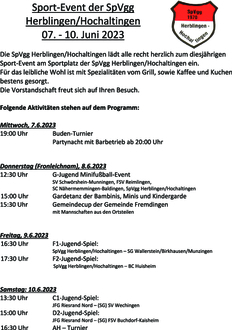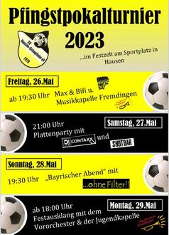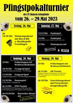 Der SV Hausen-Schopflohe e.V. lädt zum traditionellen Pfingstpokalturnier vom 26. - 29. Mai 2023 ein. Wir freuen uns auf Euer Kommen. Für das leibliche Wohl ist wie immer bestens gesorgt.