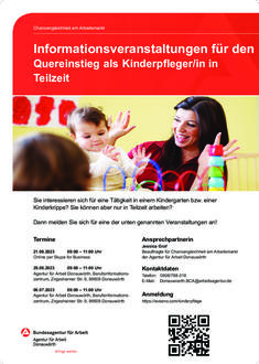 Der Bedarf an zusätzlichen Mitarbeiterinnen und Mitarbeitern in Kindergärten und Krippen ist enorm. Doch Fachkräfte sind Mangelware. Deshalb informiert Jessica Graf, Beauftragte für Chancengleichheit am Arbeitsmarkt der Agentur für Arbeit Donauwörth unter welchen Voraussetzungen der Quereinstieg in Teilzeit im Bereich der Kinderpflege möglich ist. Dabei steht vor allem die Vereinbarkeit von Familie und Beruf im Vordergrund.