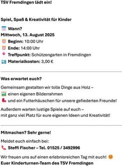 Bei Interesse bitte per WhatsApp bei Martina Nagler mit Vollständigem Namen des Kindes und Geburtsdatum melden (Handy: 0151/52041306). Wir sammeln alle Anmeldungen bis zum 14.7.25 und entscheiden nach Anmeldzahl, ob es einen oder zwei Kurse geben wird. Alle weiteren Infos folgen dann über eine WhatsApp-Gruppe.