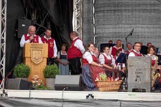 Heiß war es am Festsonntag, der mit einem feierlichen Gottesdienst auf der Mainstage startete. Zelebrant Simon Sarapak und Festprediger Joachim Pollithy drückten mehrfach ihre Wertschätzung gegenüber dem Musikverein aus. Danach spielte der Patenverein aus Maihingen zum Frühschoppen auf. Vorstand Benjamin Seefried bedankte sich bei Ehrendirigent Reinhard Reichherzer, der die Schirmherrschaft für das Fest übernommen hatte. Über 1500 Musikanten versammelten sich dann zum Gemeinschaftschor, bei dem der Glückstreffer-Marsch von Lukas Bruckmeyer als neue Erkennungsmelodie des Landkreises zum ersten Mal erklang. Schließlich marschierten Musikkapellen und Vereine über die Grünhofwiesen auf das Festgelände. Den feierlichen Festabschluss bildete ein abendliches Benefizkonzert des Heeresmusikkorps Ulm.