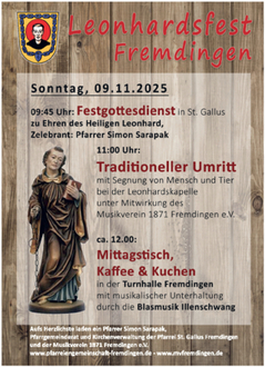 Am Sonntag, 09.11.2025 findet das tranditionelle Leonhardsfest mit Festgottesdienst, Umritt und anschließendem Mittagstisch statt.