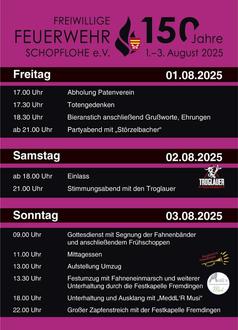 Die Freiwillige Feuerwehr Schopflohe feiert vom 01. - 03. August 2025 ihr 150-jähriges Gründungsjubiläum. Wir laden Sie herzlich ein, dieses besondere Ereignis gemeinsam mit uns zu feiern.