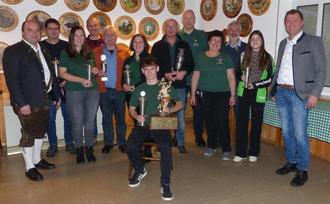 Nun ging es mit der Preisverteilung weiter. 92 Schützen gingen in diesem Jahr an den Start. In der Mannschaftswertung sicherte sich der Schützenverein Hochaltingen mit der Mannschaft Susanne Neureiter (11,1 T.), Peter Neureiter (16,1 T), Markus Lechner (22,3 T.), Julia Hotter (32,7 T.) und Lena Leberle (40,8 T.) den Pokal in der Schützenklasse. In der Jugendklasse gewann diesen die Mannschaft des Schützenvereins Fremdingen mit den Jungschützen Ralf Benninger (4,4 T.), Lucia John (19,7 T.), Maximilian Fall (53,8 T.) und Paul John (59,1 T.).