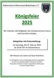 Herzliche Einladung zur Königsfeier 2025 mit Preisverleihung am Samstag, den 08. Februar ab 18:30 Uhr.