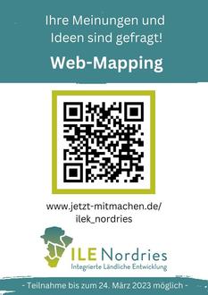 Auf einer interaktiven, digitalen Karte können Sie ihre Anmerkungen sowie Anregungen und Ideen zur Entwicklung der ILE-Region eintragen. Ihre Einträge werden anonym und ohne persönliche Daten veröffentlicht; der Datenschutz wird gewahrt. Die Teilnahme am Web-Mapping ist ab 09. Februar bis zum 24. März 2023 möglich. Zugriff auf die Karte haben Sie über www.jetzt-mitmachen.de/ilek_nordries. Alternativ können Sie den in der Grafik abgebildeten QR-Code mit Ihrem Handy scannen.