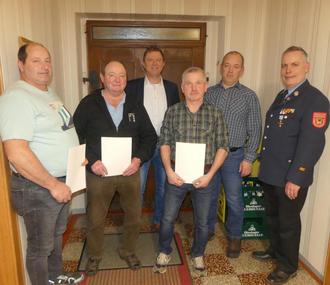 Sie sehen auf dem Bild Thomas Thorwart, Albert Holzmeier und Johann Bühler zusammen mit Kreisbrandmeister Schwager, Bürgermeister Merkt und Kommandant Stimpfle. Nicht auf dem Bild ist Franz Reiber.