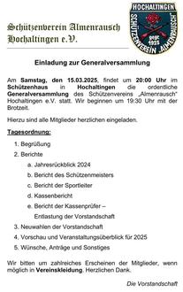 Herzlichen Einladung an alle Mitglieder zur ordentlichen Generalversammlung am 15.03.2025.