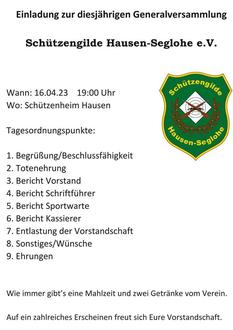 Die Jagdgenossenschaft Hausen lädt alle Jagdgenossinnen und Jagdgenossen am Freitag, den 31. März 2023, um 19.00 Uhr zu einer nichtöffentlichen Versammlung ins Schützenheim Hausen recht herzlich ein.