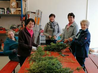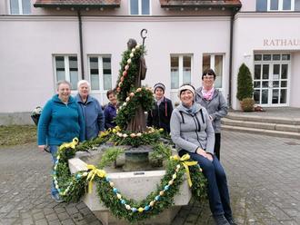 Auch dieses Jahr fanden sich wieder fleißige Mitglieder des Gartenbauvereins, die sich beim Bauhof trafen, um Buchsgirlanden zu binden und zu dekorieren. Damit wurde der St. Leonhardsbrunnen beim Rathaus geschmückt, außerdem bepflanzte 1. Vorsitzende Agnes Weiß schöne frühlingshafte Blumenkästen, die zum Schmuck von Rathaus und Brunnen dienen.