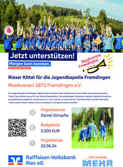 Die Jugendkapelle Fremdingen trägt seit über 40 Jahren den traditionellen Rieser Kittel als heimatverbundene Tracht. Dies möchte sie auch in der Zukunft beibehalten. Die aufwändigen Stickereien werden historisch korrekt als Kurbelstickerei ausgeführt, welche heute nur noch schwer zu bekommen ist. Der Rieser Kittel als DIE historische Tracht unserer Rieser Heimat wird so musikalisch und optisch präsent bleiben.