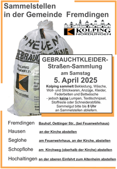 Von Kolping werden keine Säcke zur Verfügung gestellt, bitte geben Sie die Altkleider in selbst besorgte Plastiksäcke.